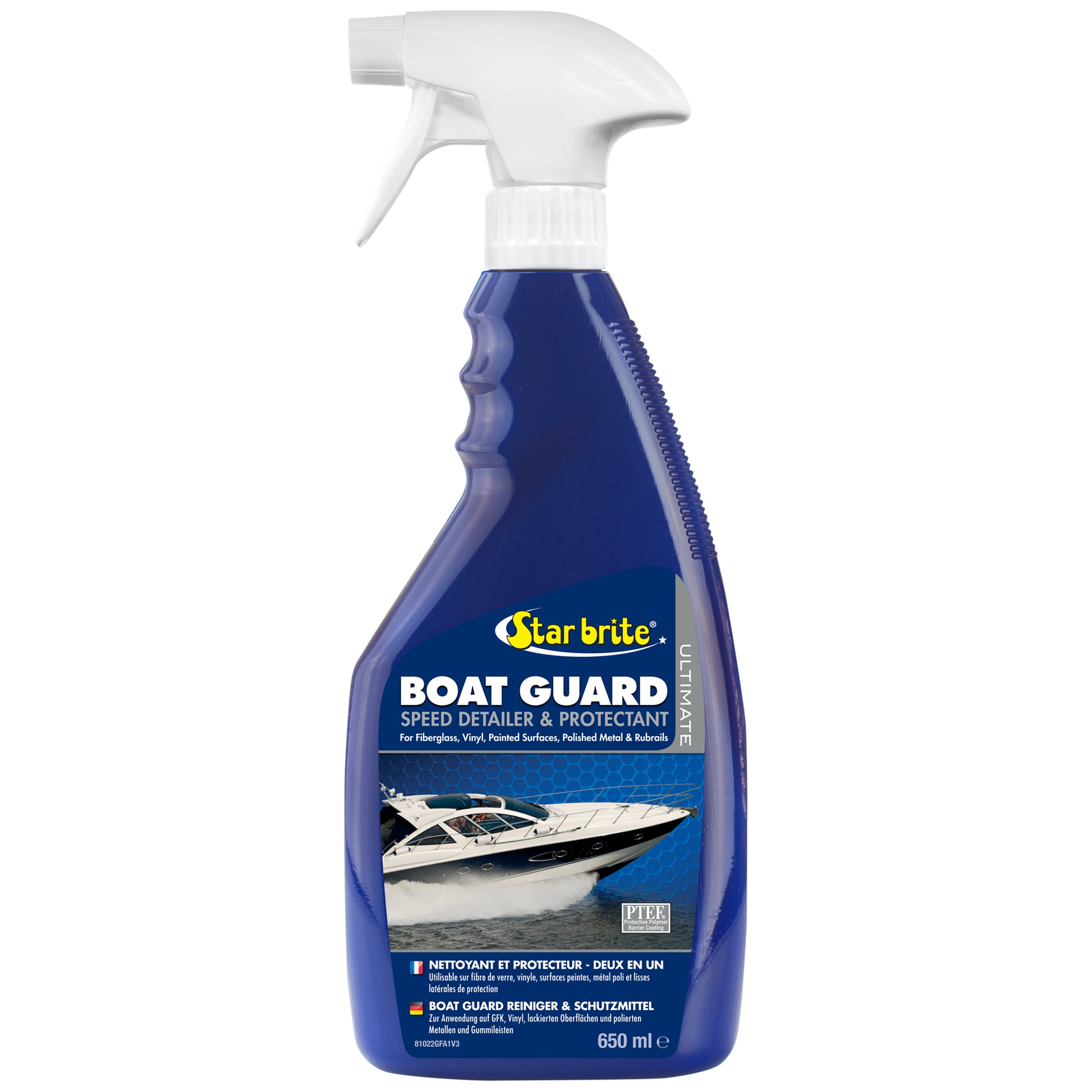 Star brite Boat Guard Speed Detailer & Protectant, your ultimate solution for boat maintenance. This high-tech polymer formula bonds to fiberglass, polished metal, plastics, rubber, and painted surfaces, enhancing color and adding a brilliant shine. It's not just a boat cleaner; it's a boat guard that provides a barrier against UV damage, extending the time between full waxing or polishings. Ideal for use on fiberglass, vinyl, painted surfaces, polished metal, and rubrails, it gently removes dirt and grime while restoring shine. The Boat Guard Speed Detailer is also perfect for auto and RV use. Its fast, easy application allows you to spray onto the surface, apply in a circular motion, let it dry to a haze, and lightly buff the area. For maximum protection, pair it with Star brite Premium Marine Polish annually. Avoid overspray onto fabric or glass to prevent stains or streaks. Experience the fast, easy way to add shine and enhance color with Star brite Boat Guard Speed Detailer & Protectant.
