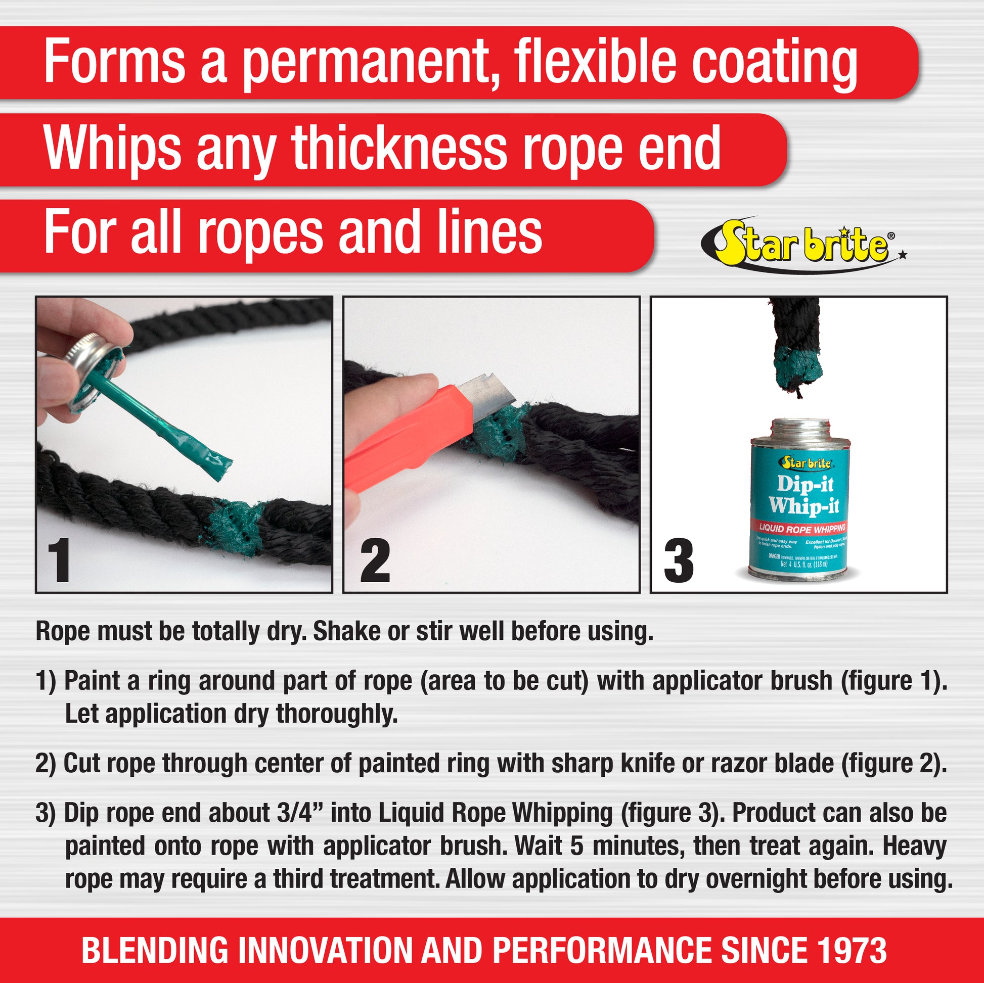 DIRECTIONS: Ensure rope is dry. Shake can well before use. Apply with the brush or dip directly, allowing overnight drying for best results. Ideal for marine and outdoor use, STAR BRITE Dip-It Whip-It offers unparalleled rope end protection.
