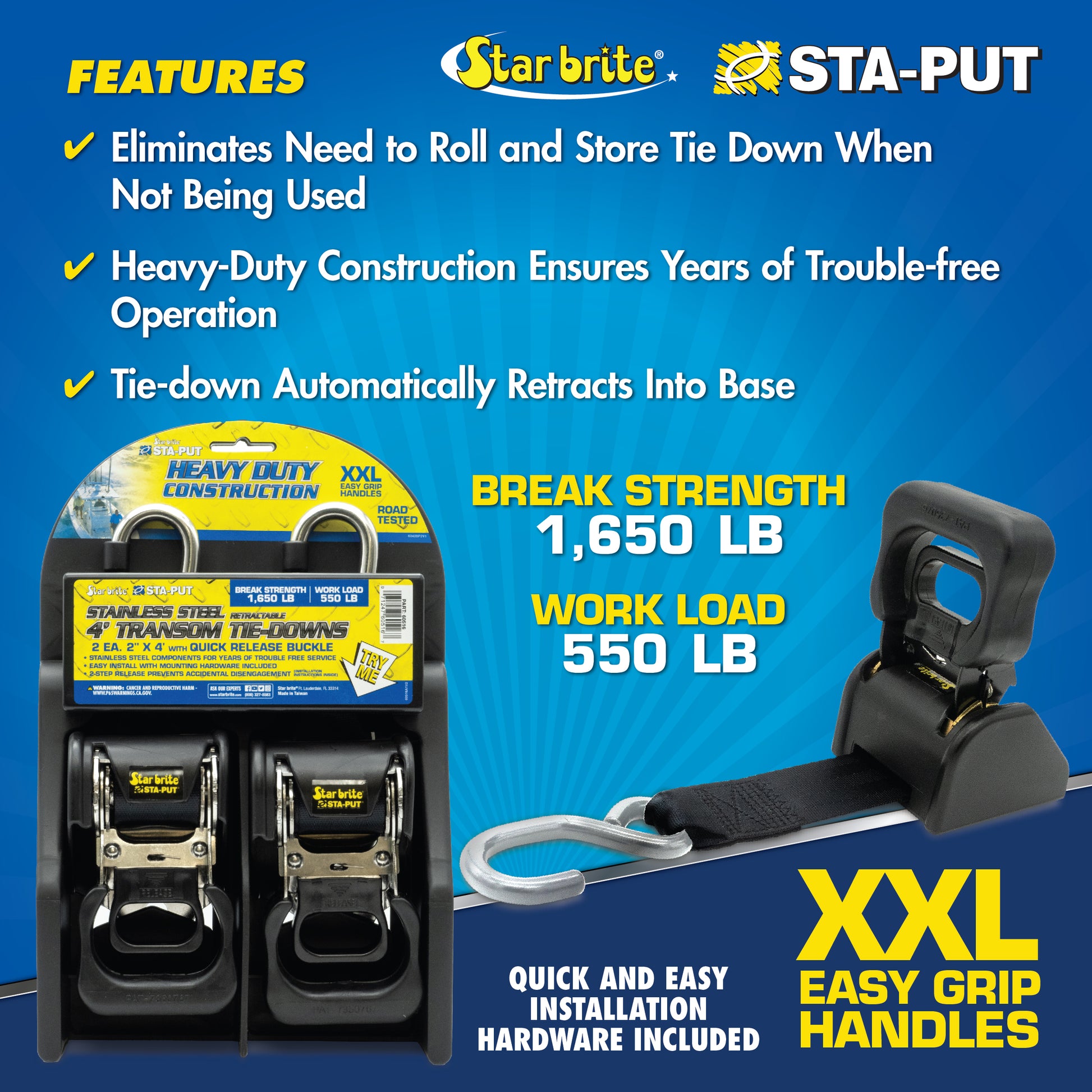 Discover the pinnacle of boat transportation security with Star brite Heavy Duty Retractable Transom Tie-Downs, featuring STA-PUT technology that eliminates the hassle of rolling and storing tie-downs when not in use. Engineered for durability and ease, these tie-downs boast heavy-duty construction for years of trouble-free operation, with a unique automatic retraction feature that ensures your tie-downs stay neatly tucked away. The robust XXL easy grip handles facilitate a secure grip, while the 4' transom tie-downs, consisting of two 2" x 4' straps with quick-release buckles, offer a perfect balance of convenience and strength. Stainless steel components guarantee longevity, and the comprehensive package includes all necessary mounting hardware for a straightforward installation. The two-step release mechanism is designed to prevent accidental disengagement, ensuring your boat remains securely fastened during transport. These tie-downs have been road-tested to meet the highest standards of reliability, with a break strength of 1,650 lb and a work load capacity of 550 lb, promising unmatched security for your vessel.