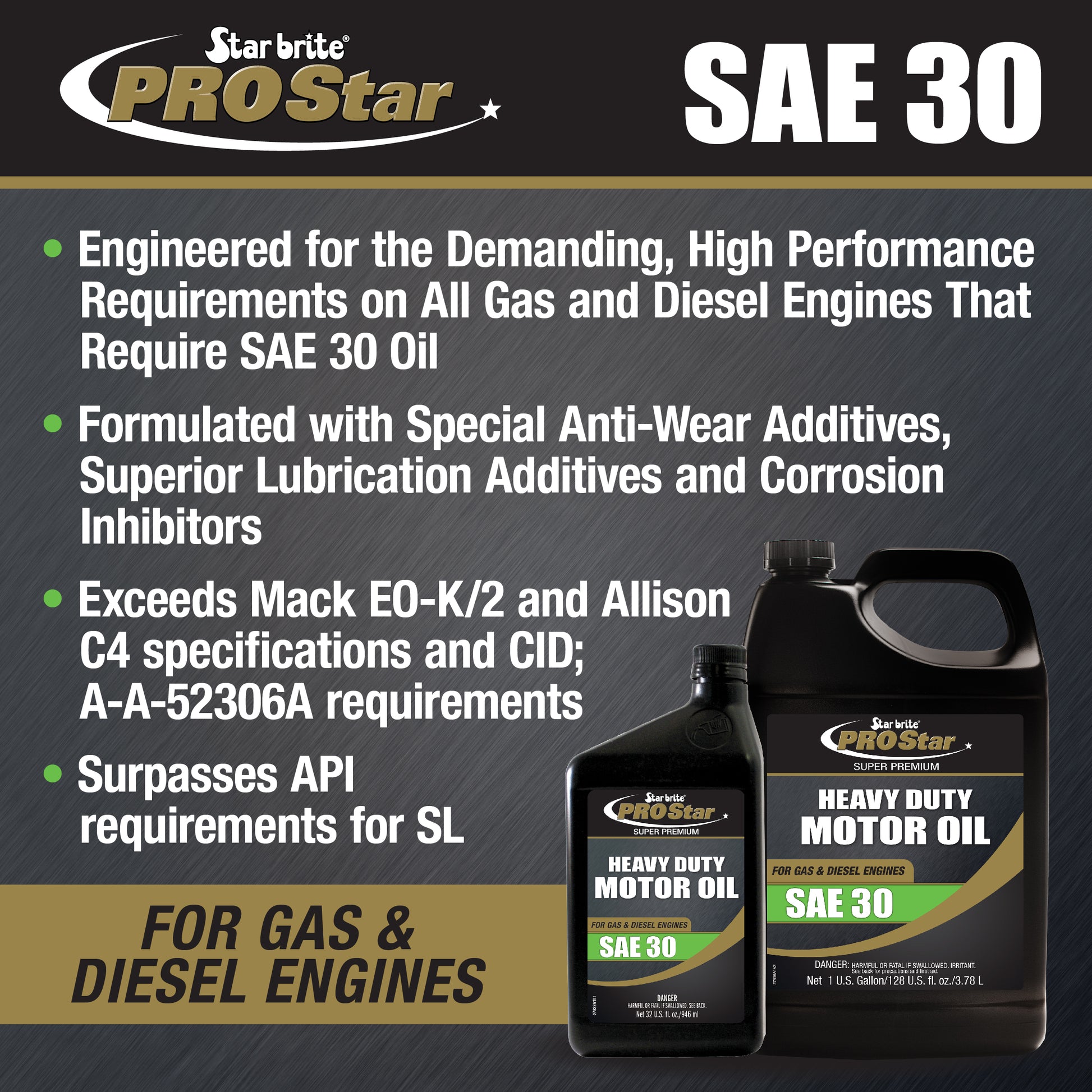 DIRECTIONS: Use Star brite PROStar SAE 30 Motor Oil as recommended by your engine manufacturer for gas and diesel engines that require SAE 30 oil. Ensure regular oil changes for optimal engine performance.
