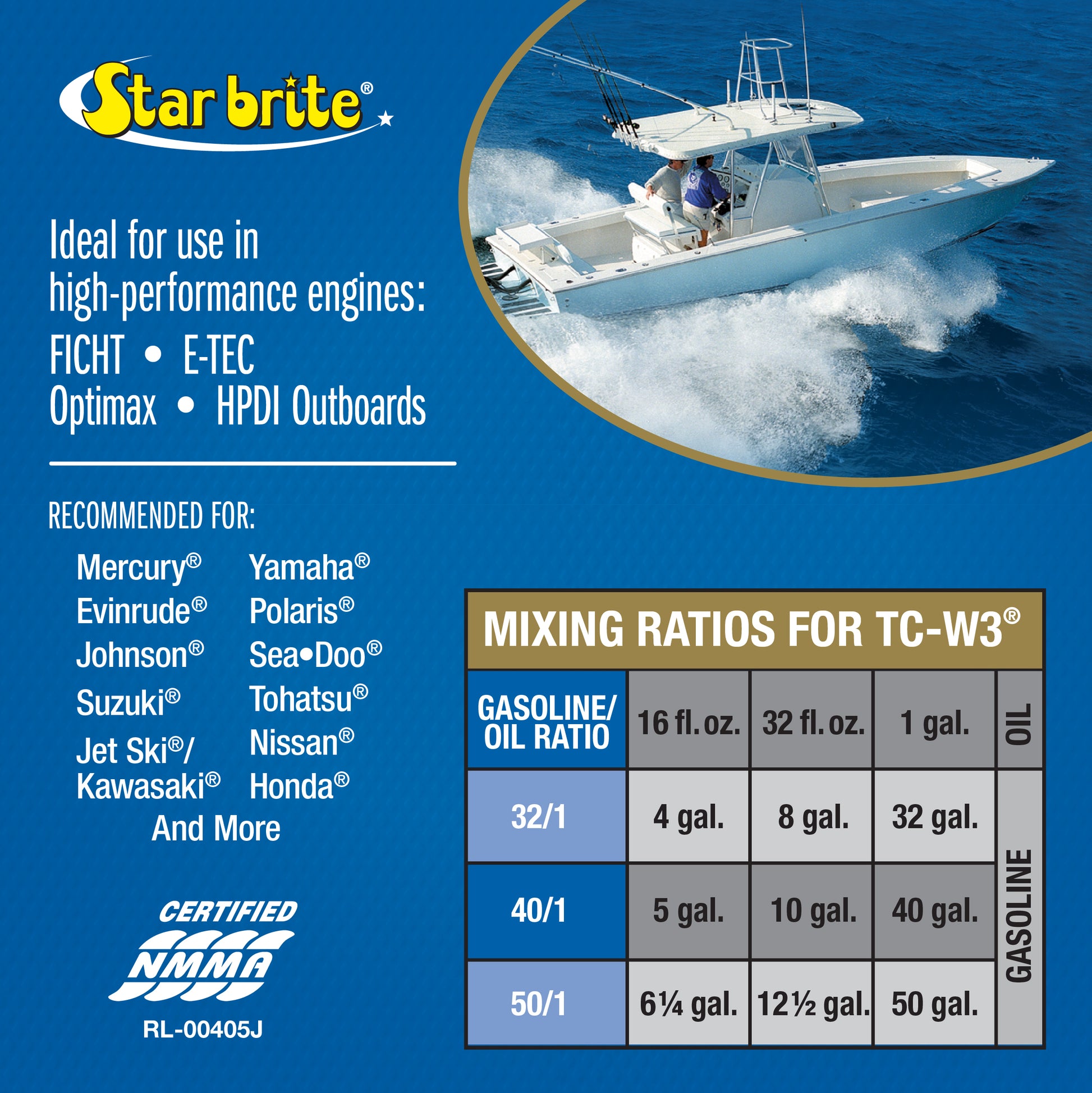 Introducing Star brite Super Premium+ 2-Cycle Synthetic Blend TC-W3 Engine Oil, the ultimate choice for all outboard motors and personal watercraft. This superior synthetic blend oil is specifically formulated for high-performance engines, including FICHT, E-TEC, Optimax, and HPDI outboards. It's also perfectly suited for pre-mix and direct-injection designs. With a unique additive package, it surpasses all OEM oils, adheres to all engine manufacturer specifications, and contains a higher concentration of additives compared to Premium TC-W3. This 2-cycle engine oil delivers unparalleled performance and protection. It features a PIB viscosity modifier to enhance lubricity and minimize smoking, while its high-detergent, ashless formula effectively removes deposits from the fuel delivery system, prevents piston ring sticking, and safeguards against pre-ignition issues. It's eco-friendly, reducing emissions and providing exceptional protection under high-stress loads and peak operating temperatures. Trust Star brite for your 2-cycle engine oil requirements.