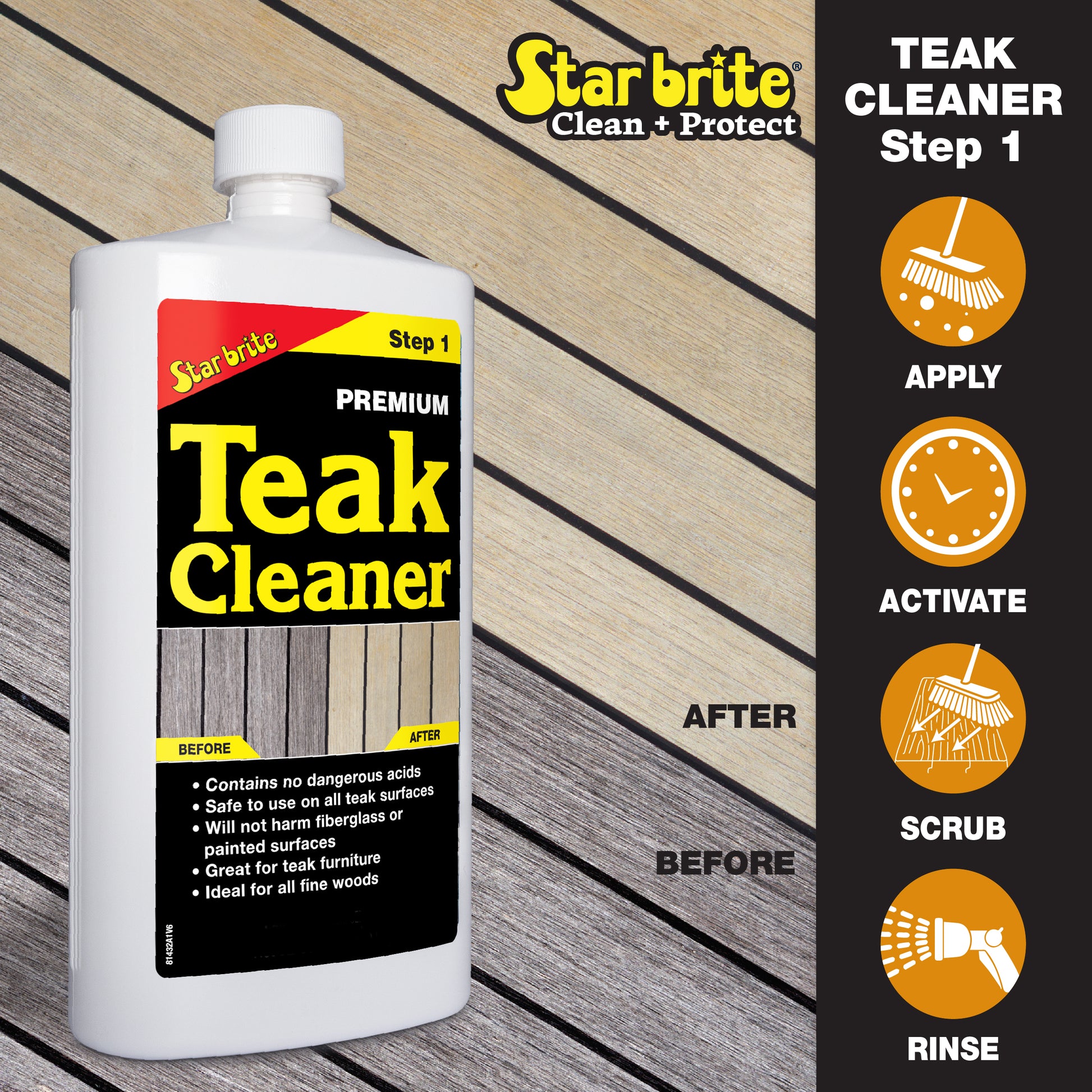 DIRECTIONS: For badly weathered, grey or black teak, apply Teak Cleaner & Brightener directly to dry wood. Use a stiff bristle cleaning brush or STAR BRITE Medium Scrub Pad to spread the product evenly. Allow Teak Cleaner & Brightener to remain on surface for approximately two to three minutes before scrubbing. Scrub in the direction of wood grain to ensure deep cleaning before thoroughly rinsing wood with fresh water. Severely dirty or stained wood may require a second application and use of STAR BRITE Stainless Steel Teak Scrub pad.