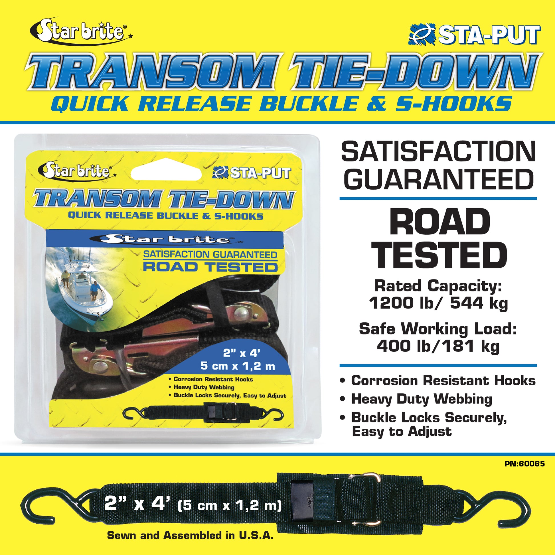 The Star brite Transom Tie Down Strap is built for secure, reliable boat transport. Measuring 2" wide by 4' long, it features heavy-duty polypropylene webbing, a quick release buckle, and corrosion-resistant coated S-hooks to protect surfaces from scratches. With a rated capacity of 1200 lbs and a safe working load of 400 lbs, it provides dependable holding power for your boat and trailer. Proudly sewn and assembled in the USA, this strap is designed for long-lasting performance in marine environments.